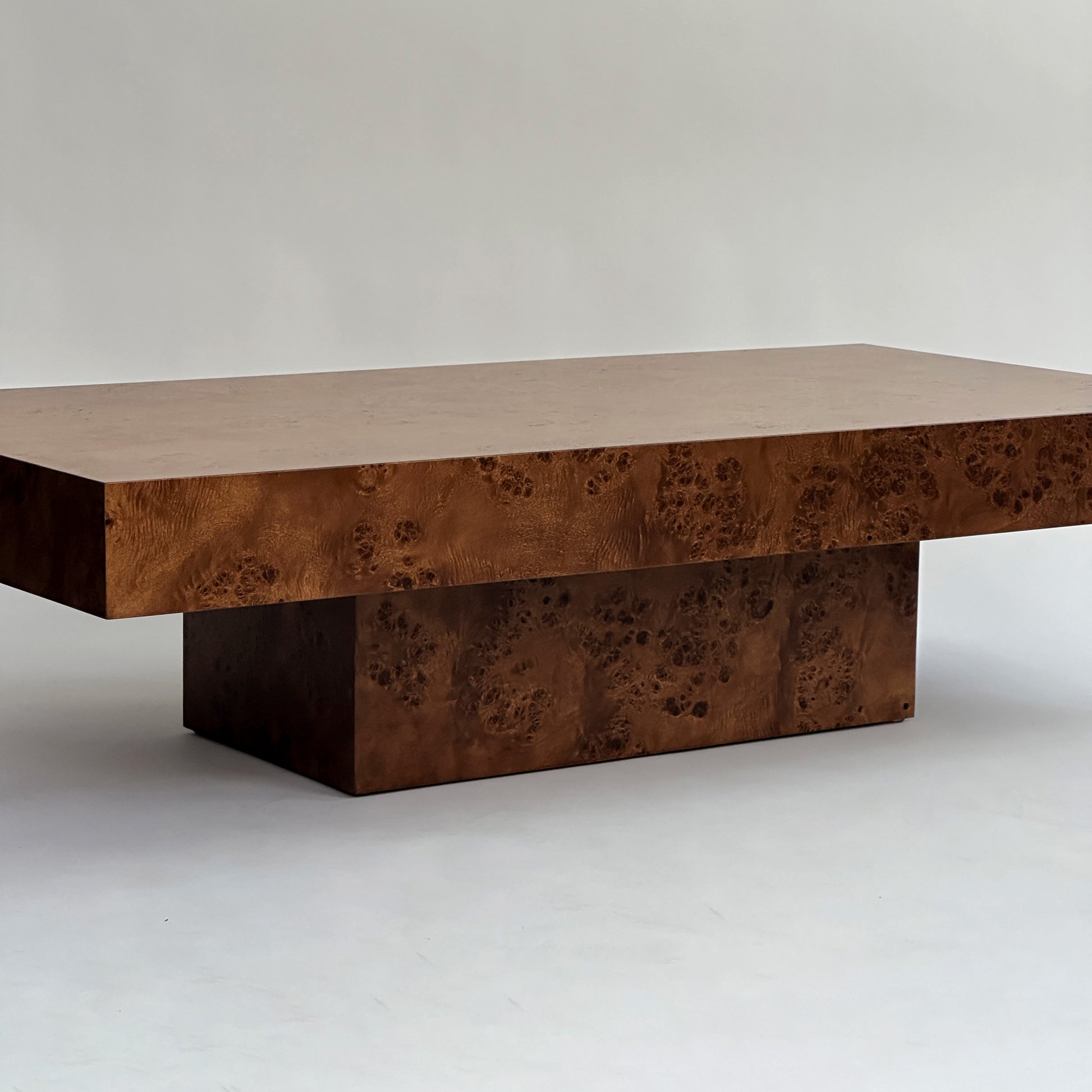 Each surface is veneered with a single sheet of natural poplar burlwood, emphasizing the intricate grain, rich tone, and organic depth of the wood. Every piece is truly one of a kind — no two veneer patterns are ever identical — ensuring your coffee table stands as a unique work of craftsmanship.