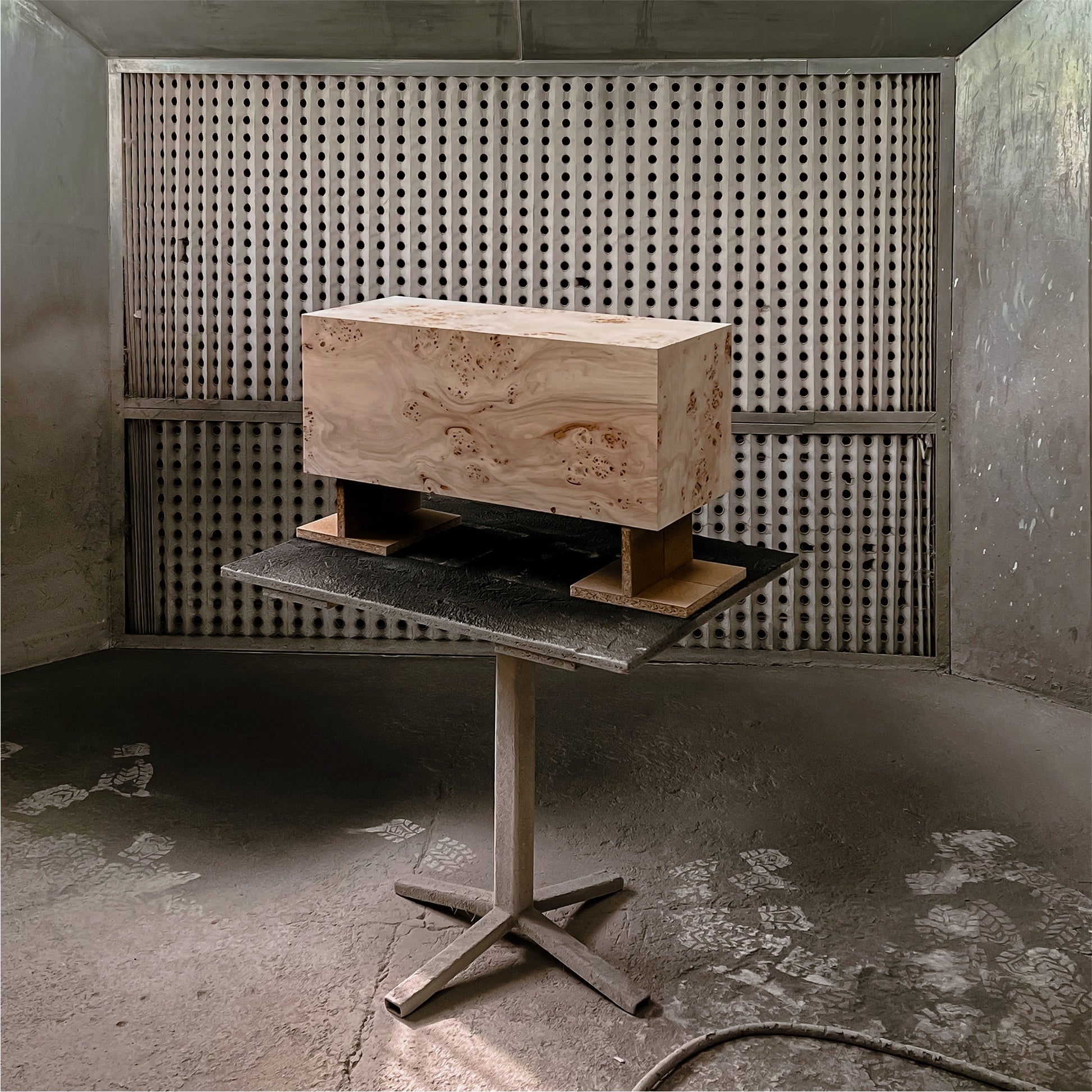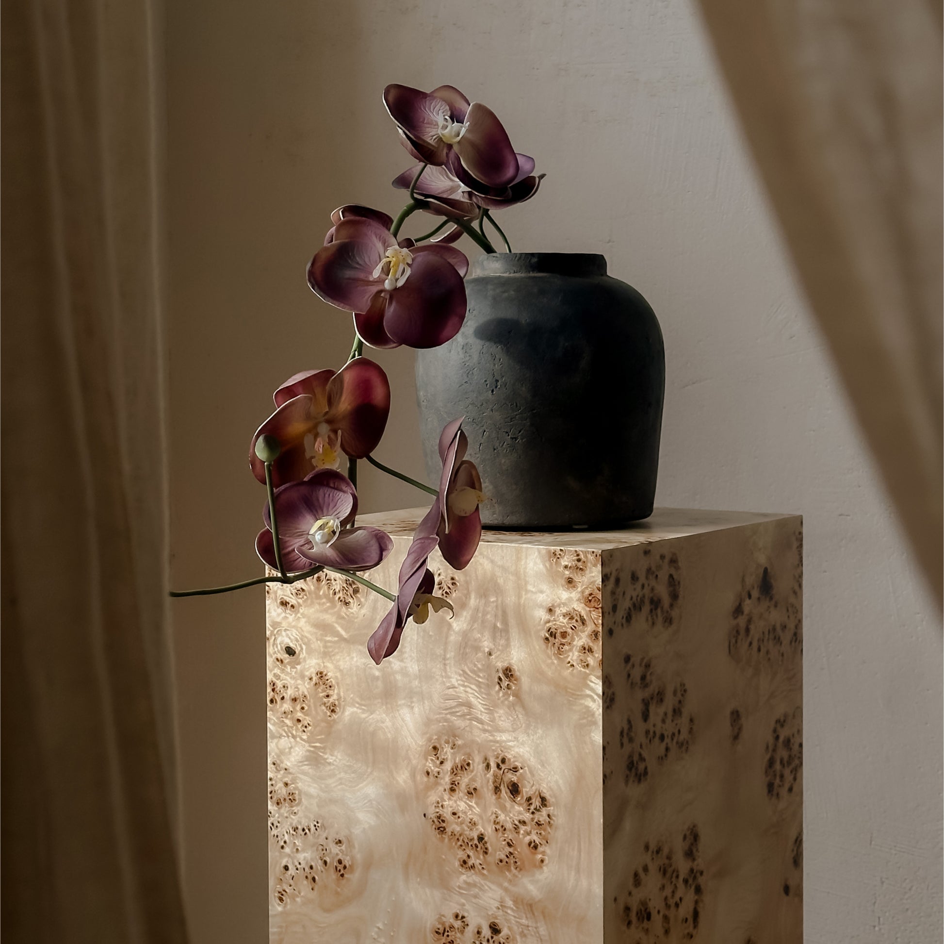 Each side is veneered with a single sheet of natural walnut burlwood, creating a seamless finish that highlights the unique depth, grain, and character of the wood. No two plinths are ever the same, making each table a one-of-a-kind addition to your home or gallery.