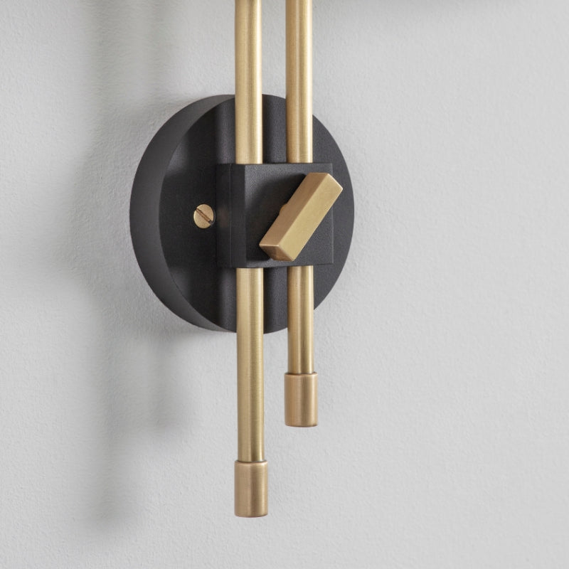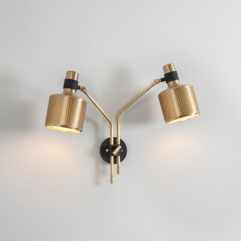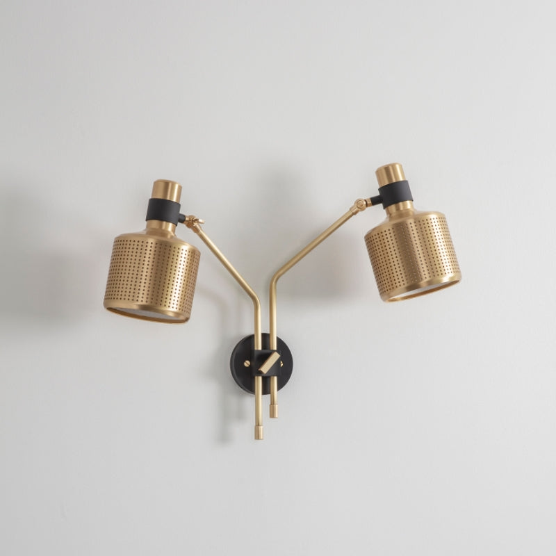 Twin articulated, perforated metal shades with fabric inserts provide a soft wash of light allied to the ability to illuminate a feature