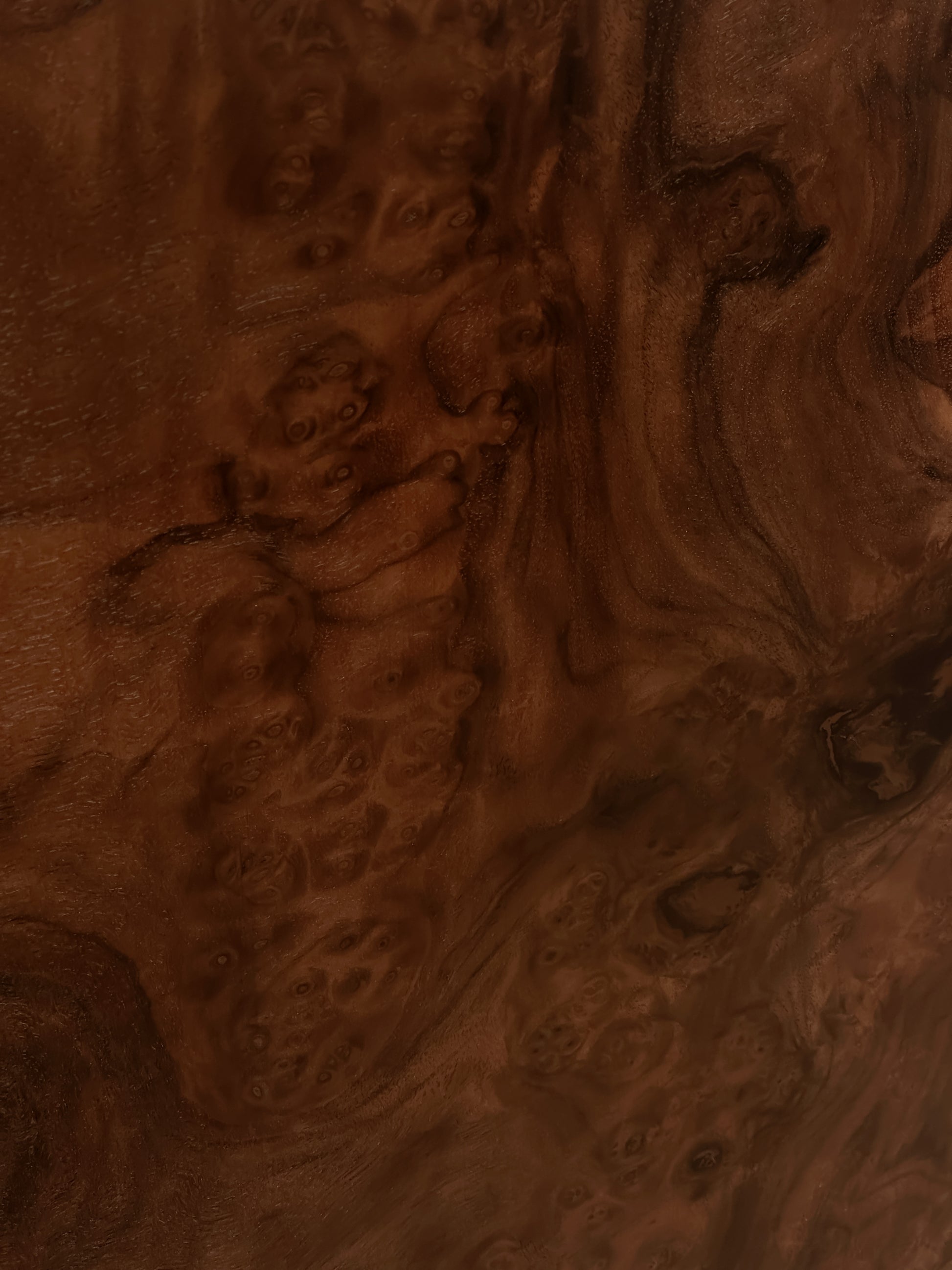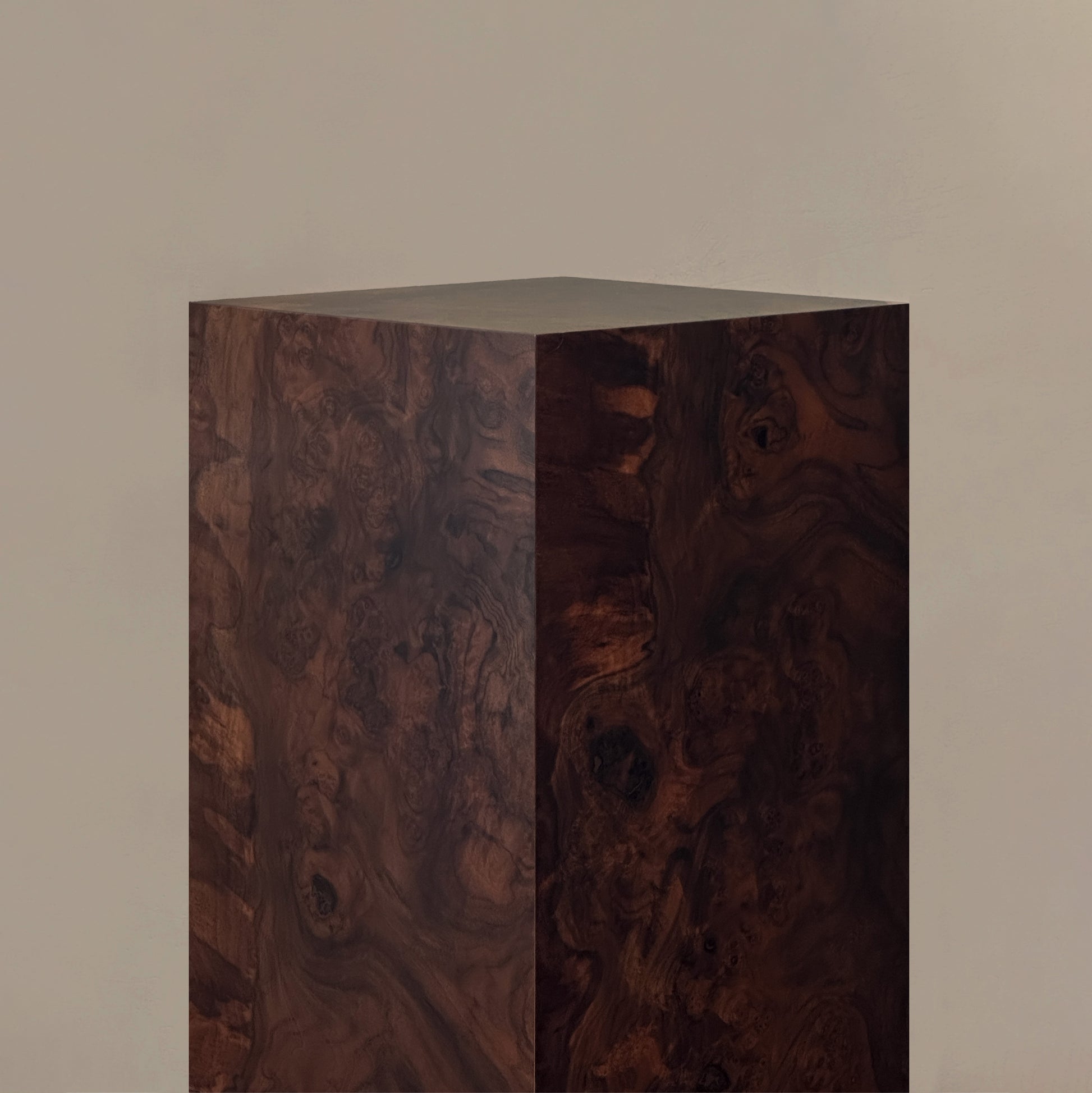 Each side of the plinth is veneered with a single sheet of natural walnut burlwood, creating a seamless finish that highlights the unique grain and depth of the wood. No two pieces are ever alike — each plinth is as individual as the interior it inhabits.